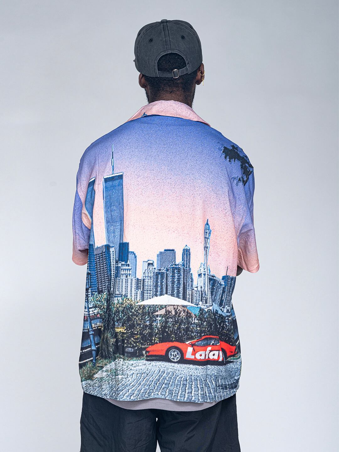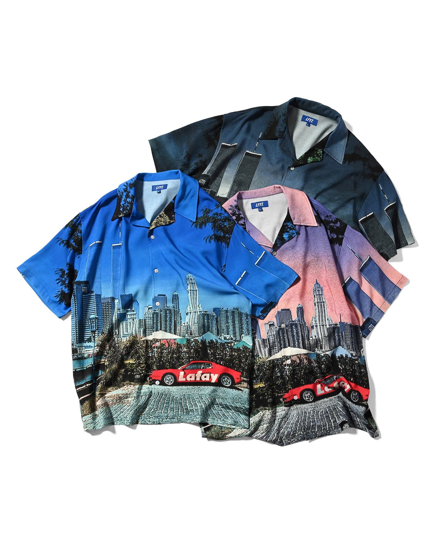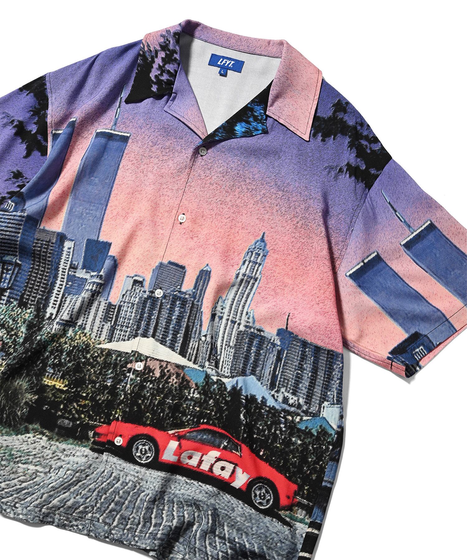 マンハッタンの街並みをパターンに使用した開襟シャツ。