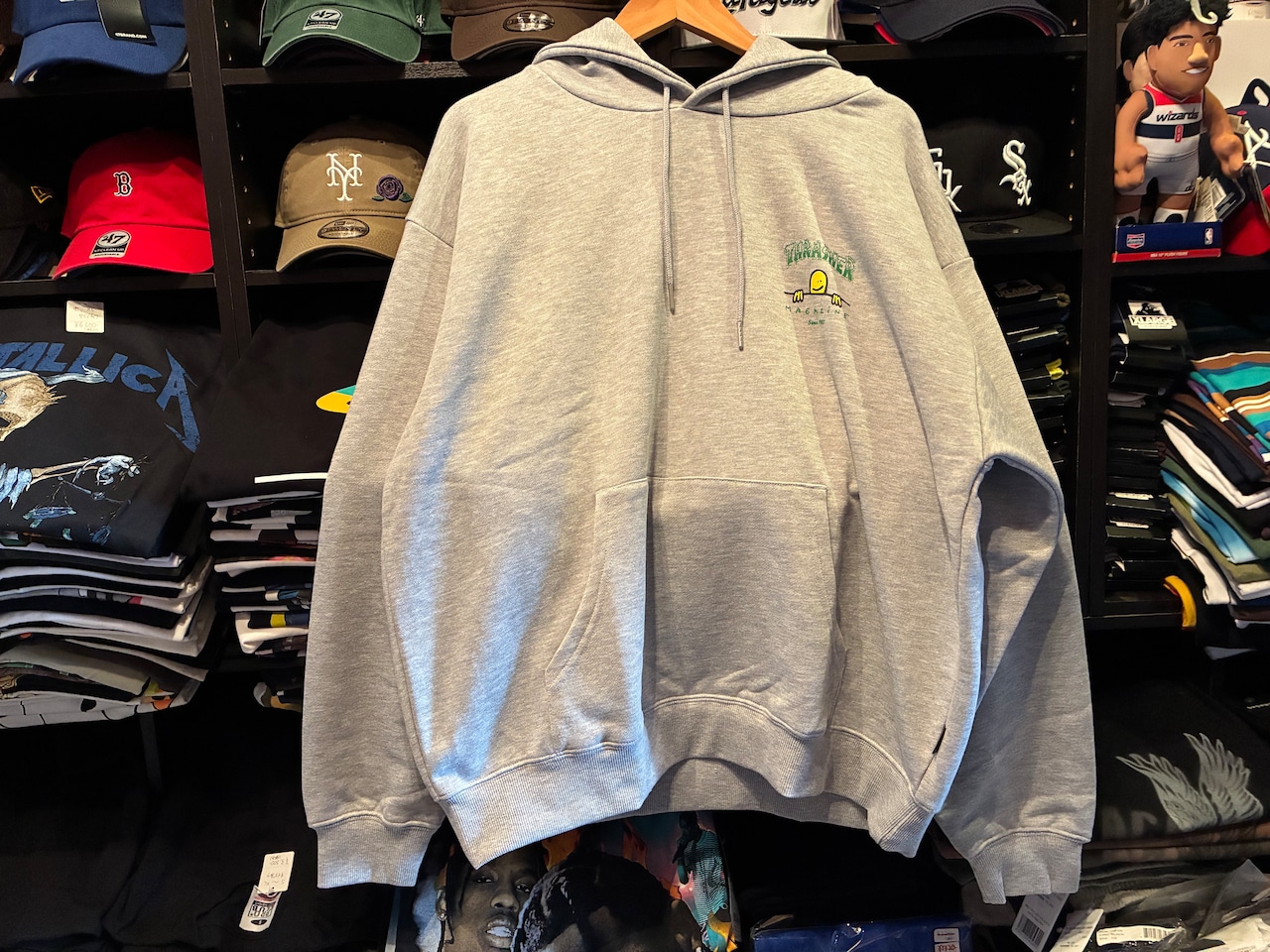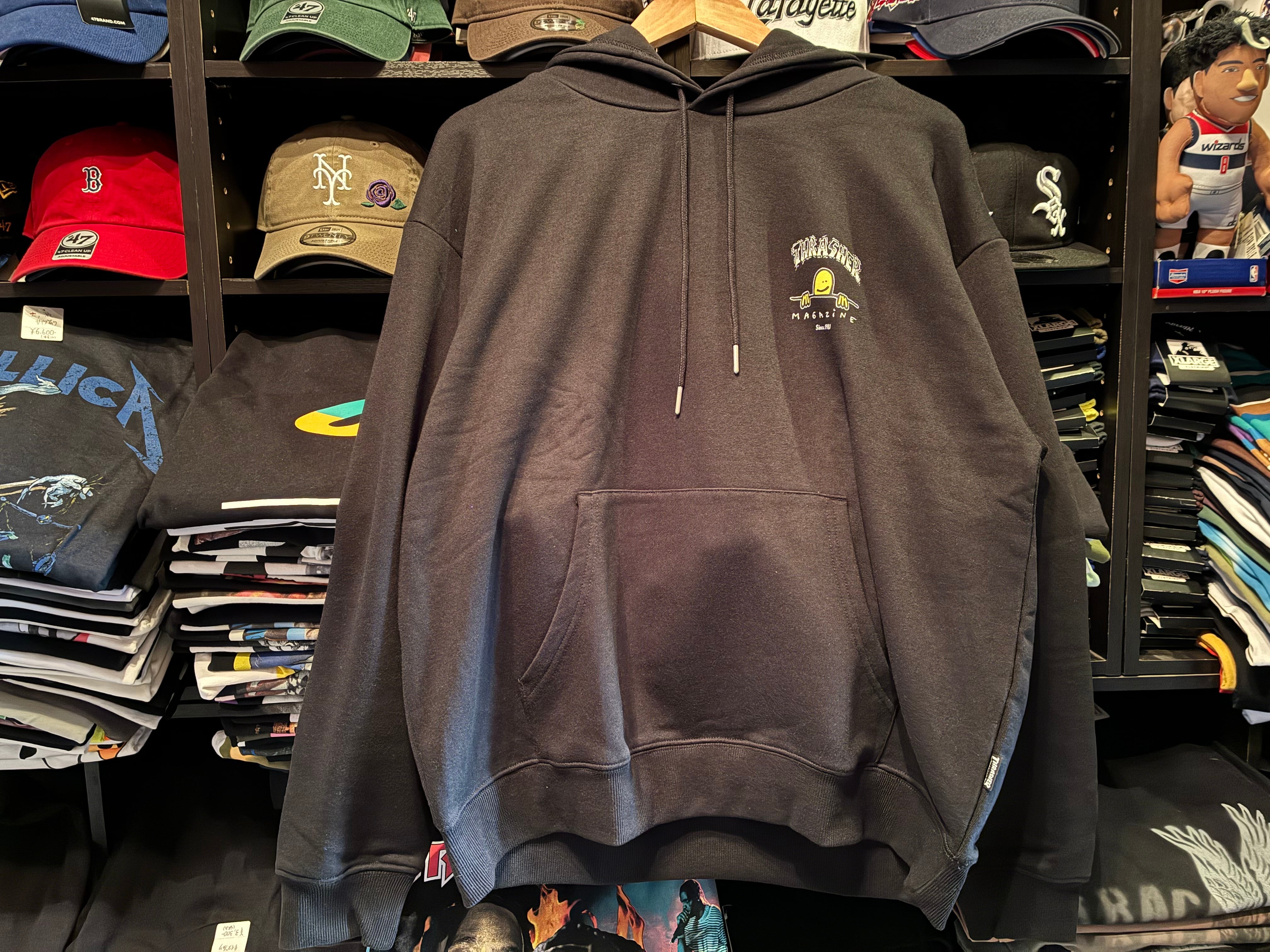 マークゴンザレスのキャラクターとTHRASERロゴがデザインされたプルパーカー。裏毛素材の柔らかな生地感で、これからの時期はアウターのインナーなどにも使えるし、裏毛素材なので春先まで長いシーズン着用可能。フロントはバック同様のロゴ&キャラクターのワンポイントデザイン。アメカジ、ストリート、古着風、韓国ファッションなど様々なコーデに合わせやすい。女性の方にもおススメのユニセックスアイテム。