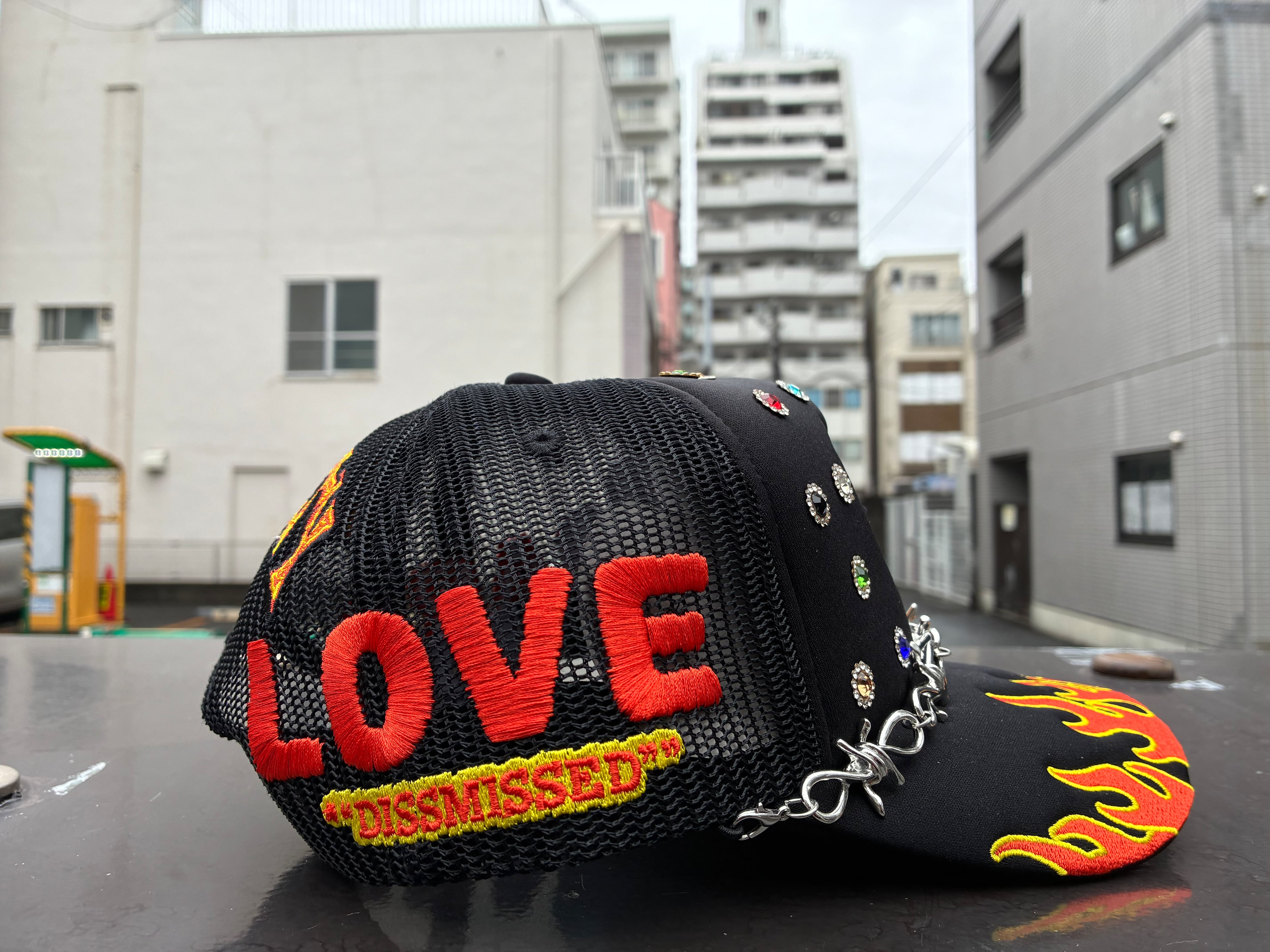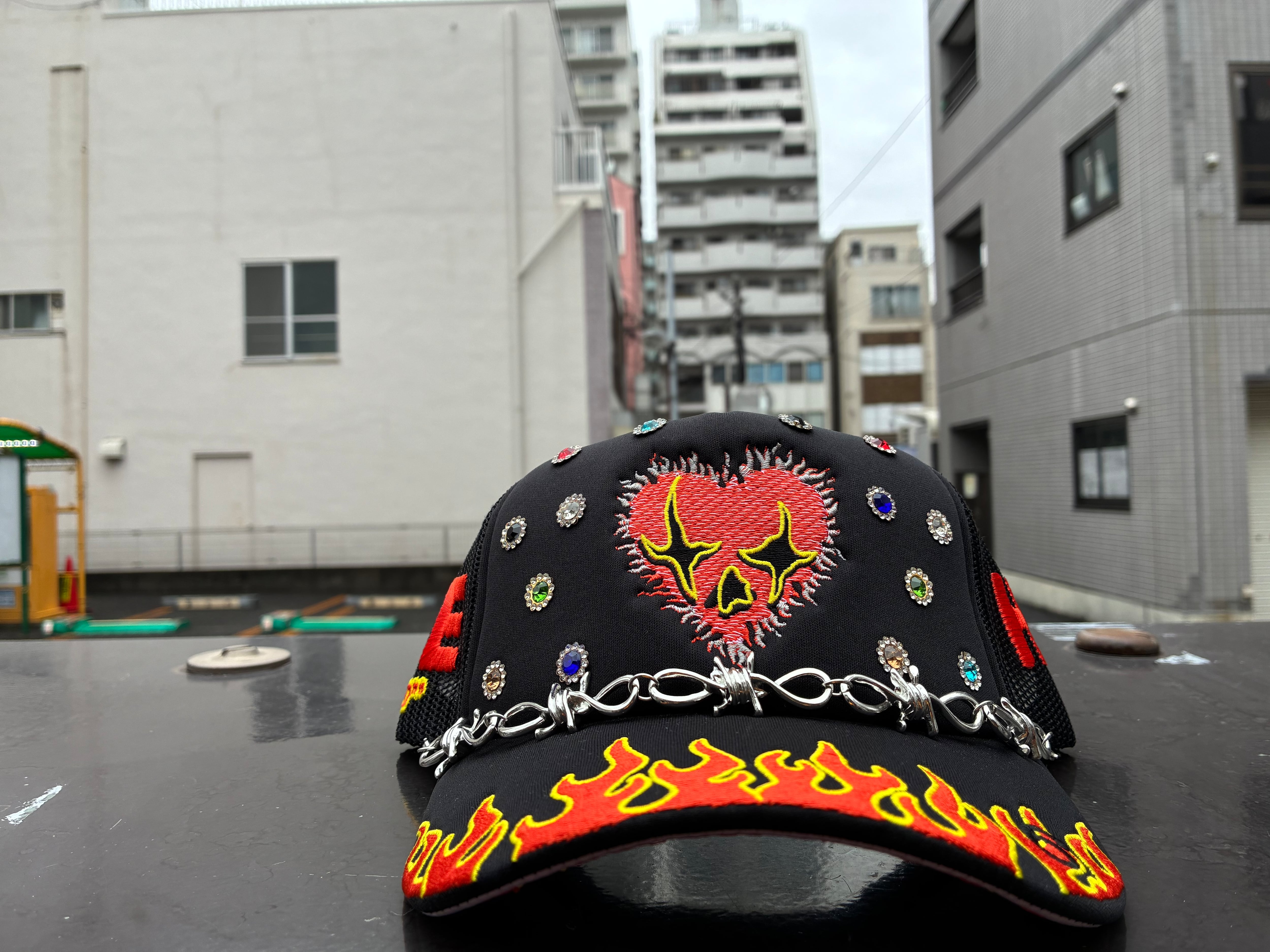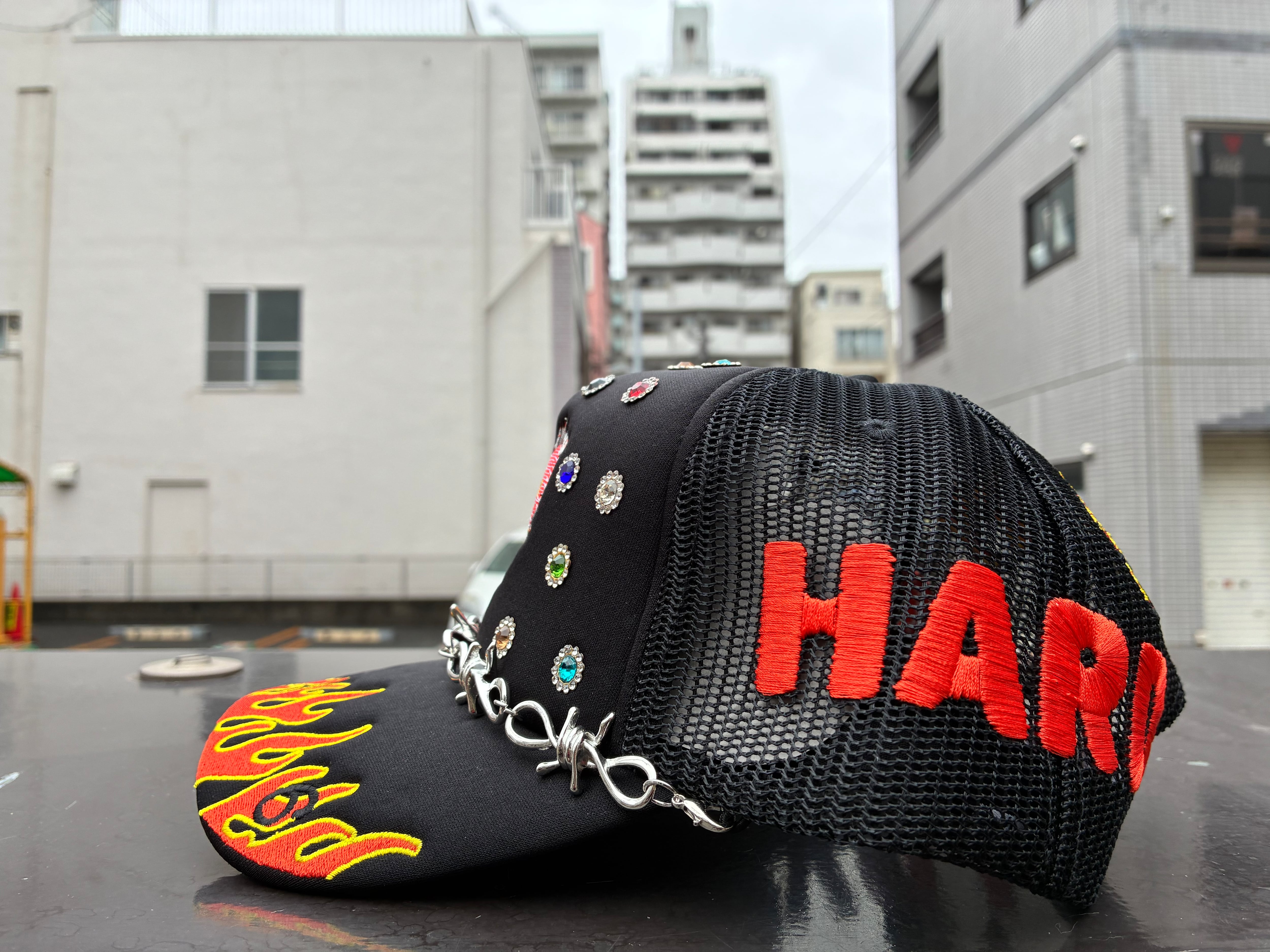目を引くジュエリー等が光輝き洗練されたこだわりのメッシュキャップとなっております。