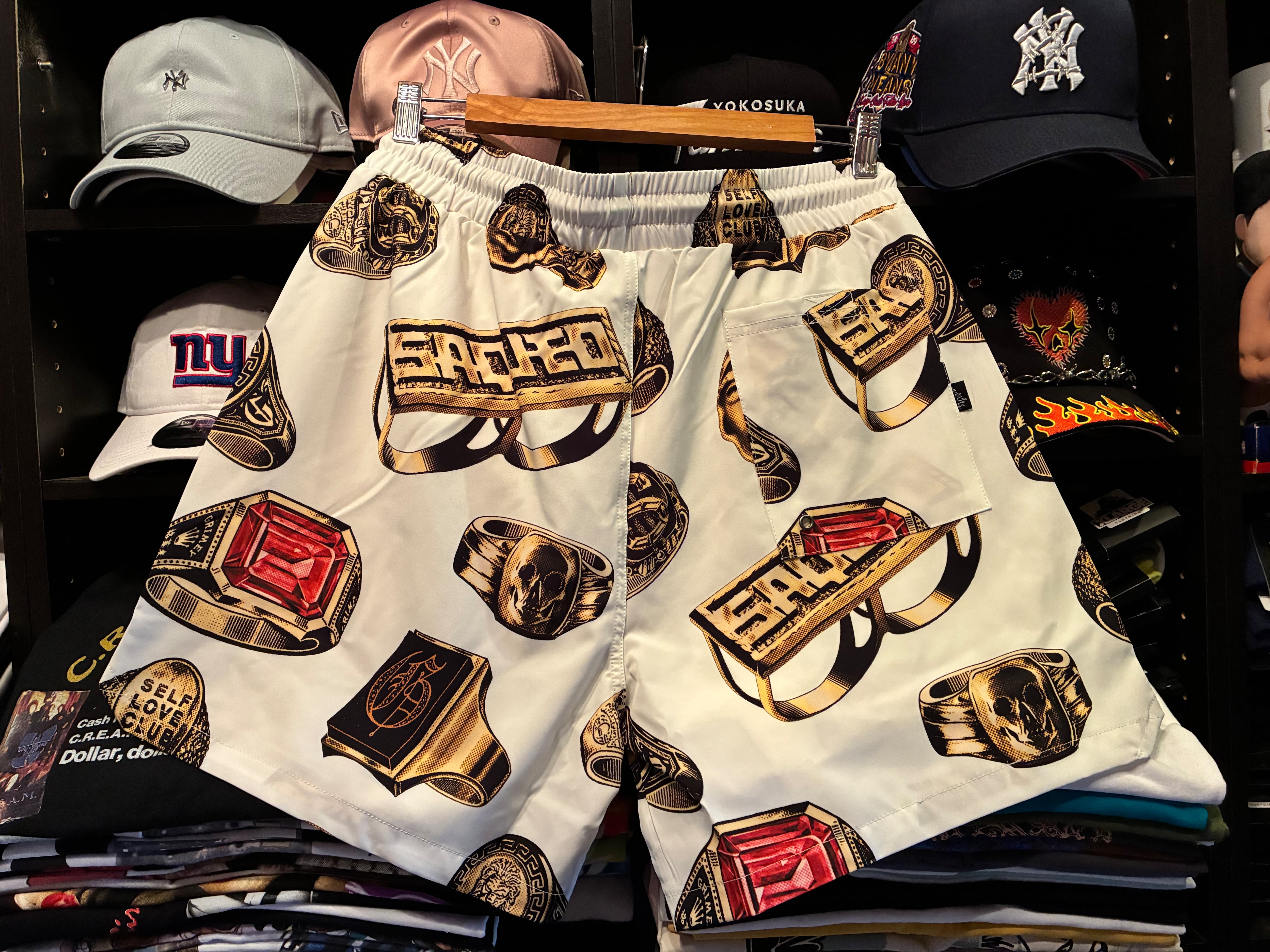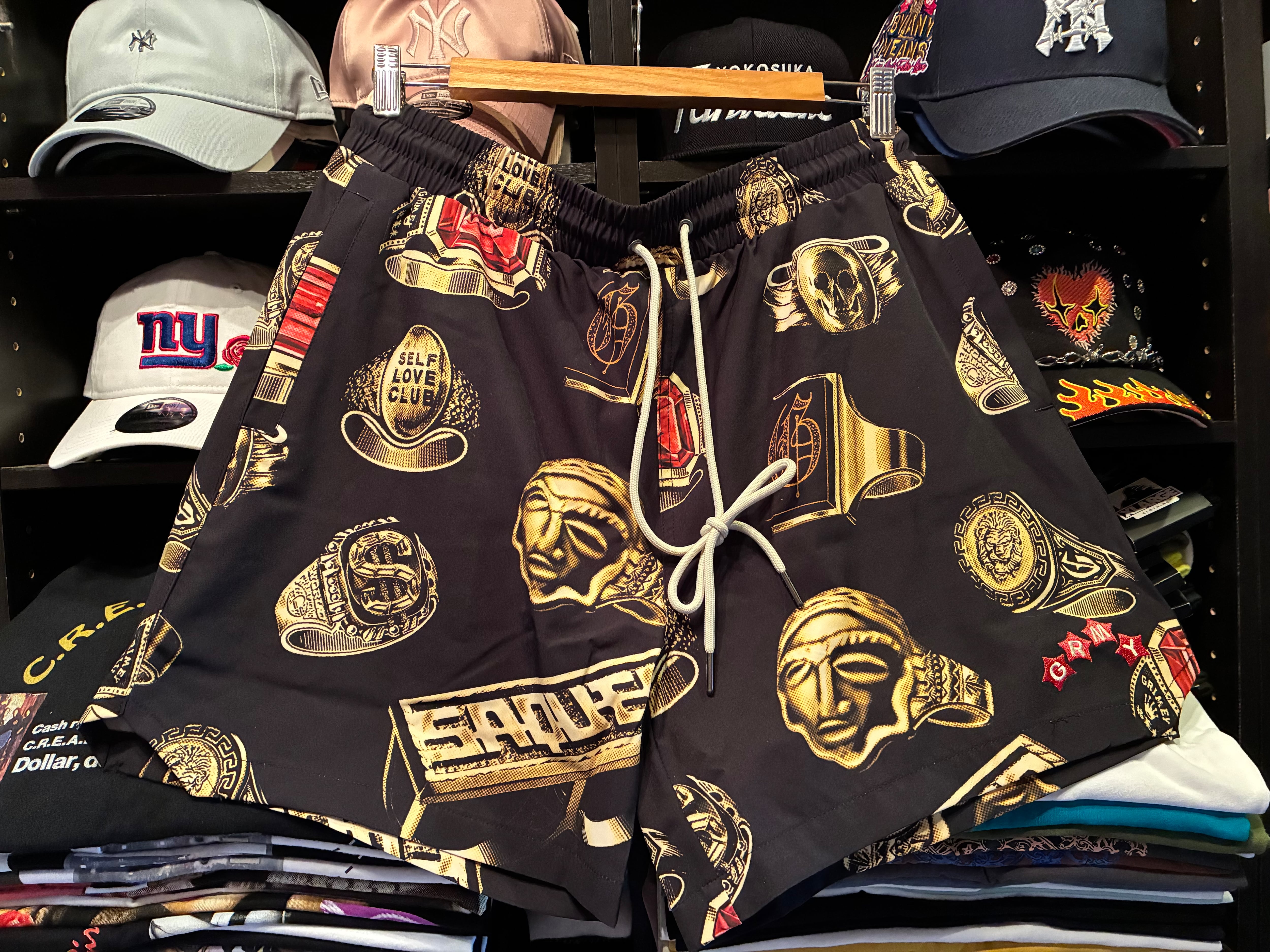ラグジュアリーな雰囲気のゴールドリングを全面に配した総柄デザインのショートパンツ。「SAQUEO」の文字が刻まれたナックルダスターやスカルリングなど、GRIMEYらしい遊び心満載の毒のあるモチーフが、黒地のボディに鮮やかに映えるアイテム。さらりとした質感でサマーシーズンも快適に。インナーメッシュサポーター付きでスウィムショーツとして、ビーチはもちろん、ストリートでも大活躍間違い無しのアイテム。同デザインのシャツとのセットアップコーデもおすすめです。