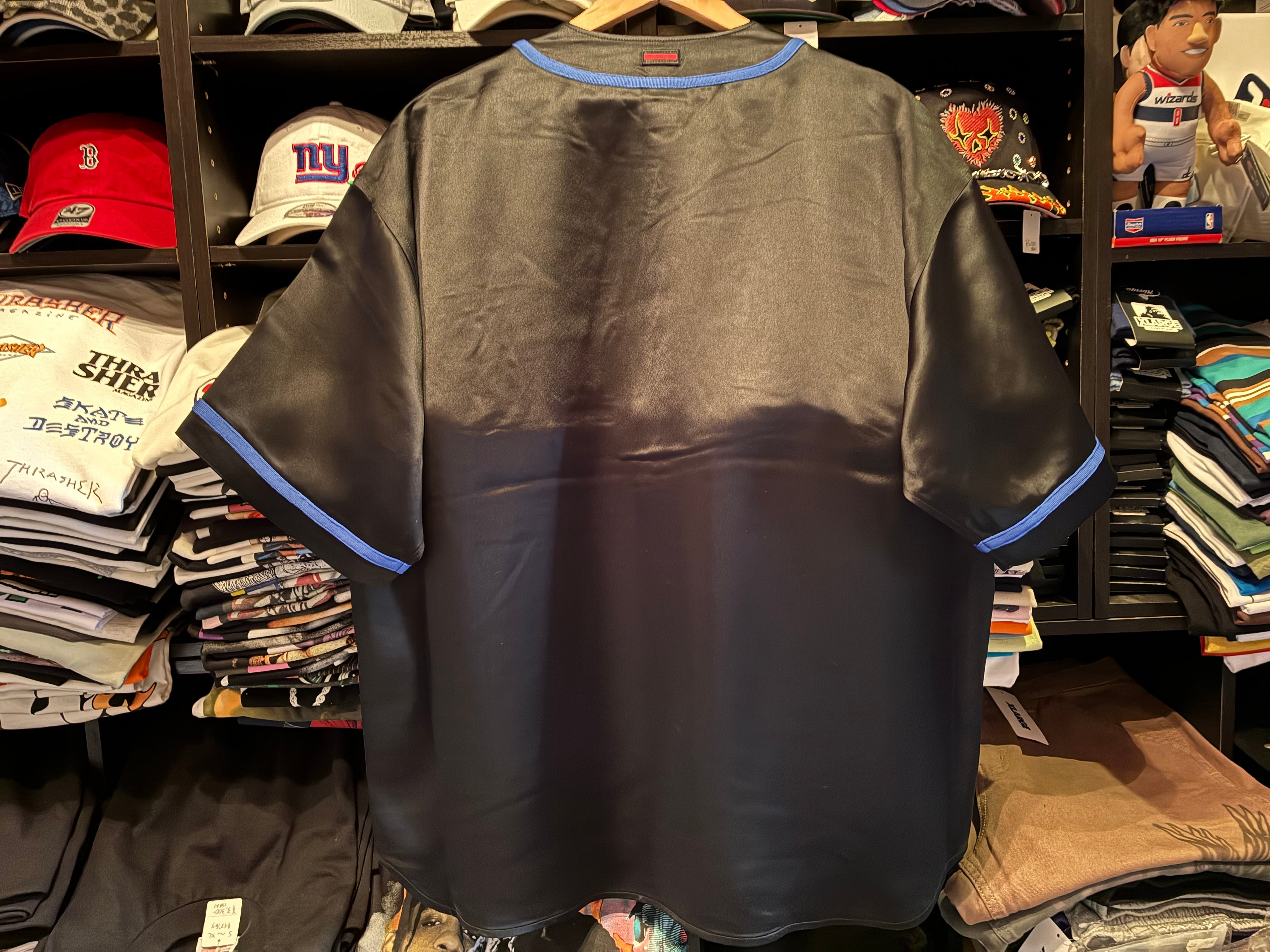 素材は光沢感のあるサテン生地を使用したベースボールシャツ。軽く滑らかな素材感で、ストリートファッションに映える上品な光沢が特徴です。